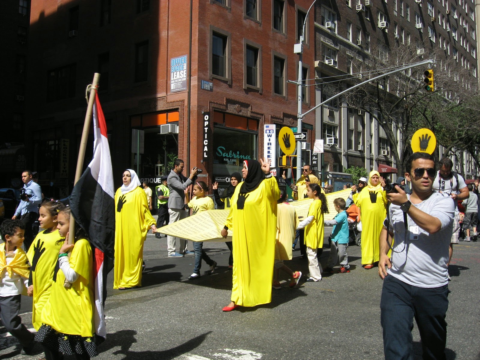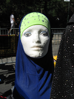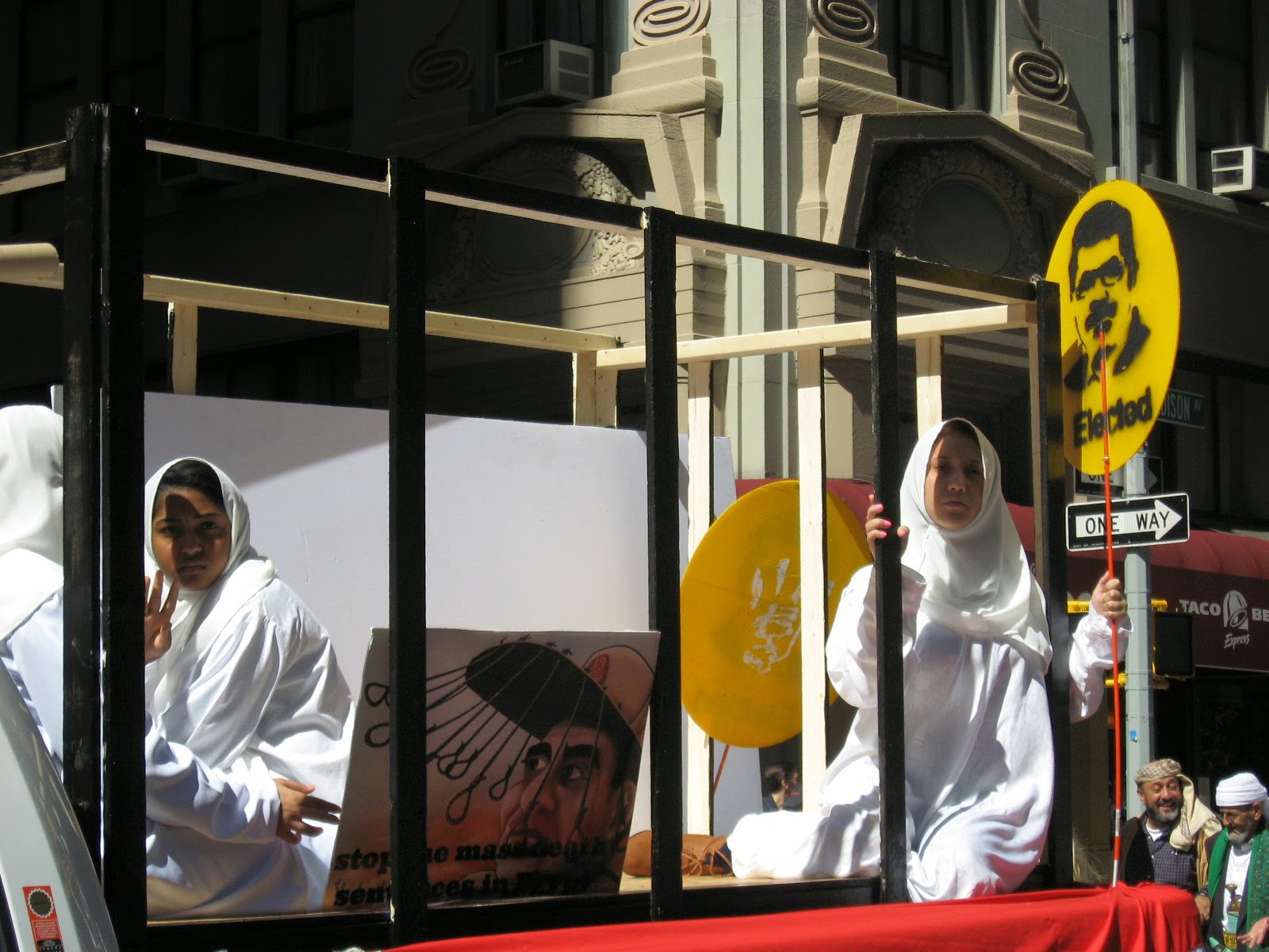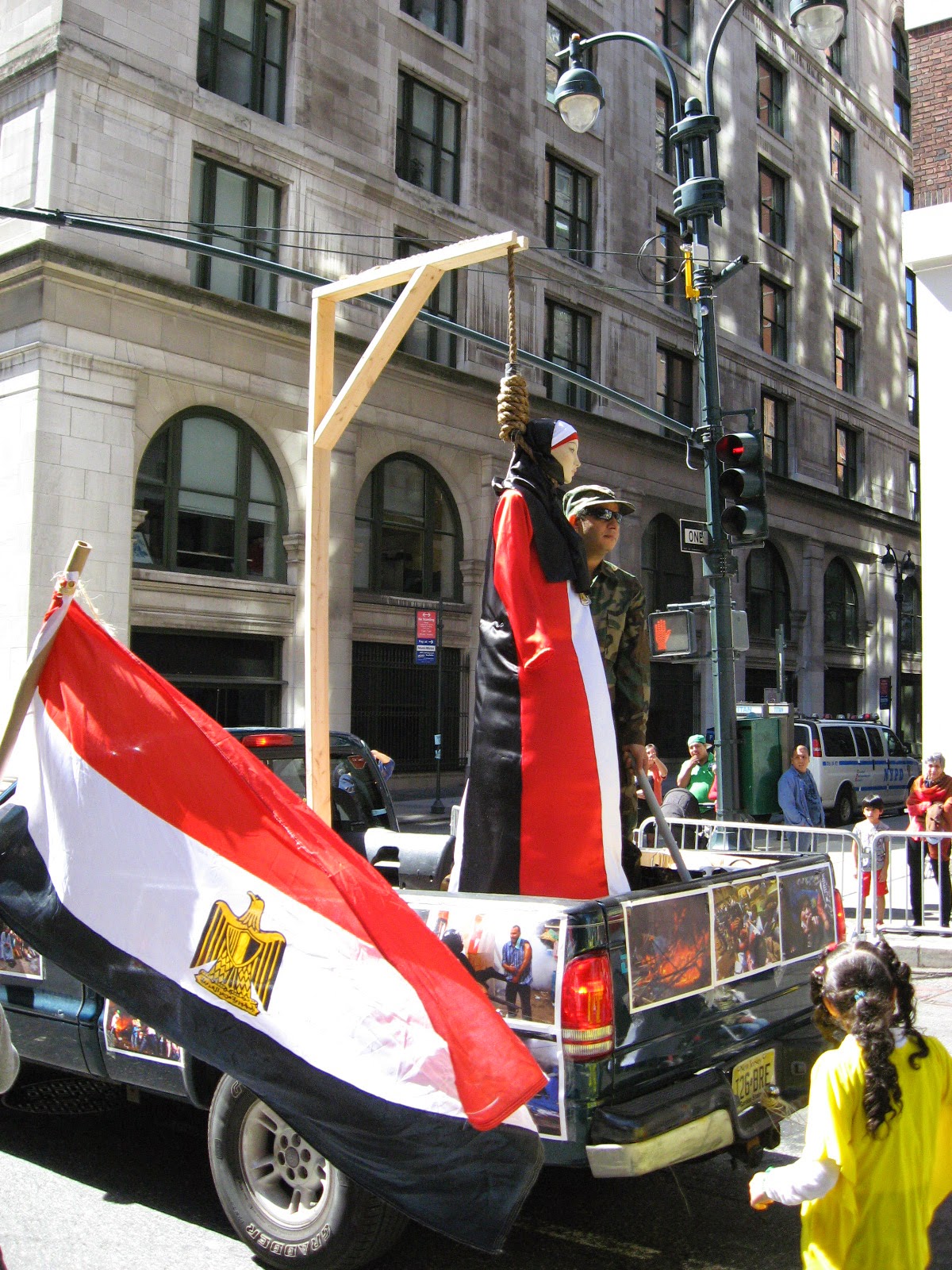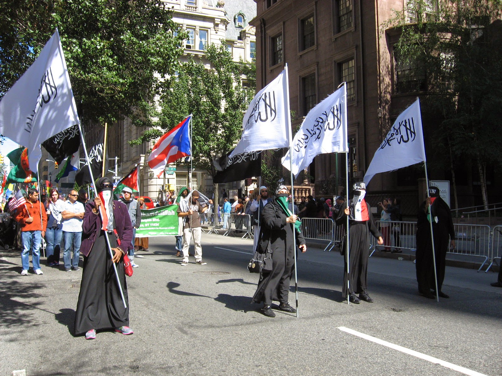 Virtually stripped of all political street theater it was smaller than any other parade over the last several years. No black flags of jihad flying, no blood-drenched Muslim Brotherhood photo displays or white-robed, somber women trucked down the avenue in a cage. Gone was the female effigy swinging from a noose, overseen by thugs dressed up like thugs brandishing 'play' automatic weapons, and whip-cracking ‘Pharoahs’ being pulled on chariots by demonstrators dressed at Egyptian military etc. Absent of any spectacle, one might almost have to ask: 'Was it really even a Muslim Day Parade?' Also missing from the march were children from various private Muslim schools as well as certain mosques throughout the city quite notable by their omission.
