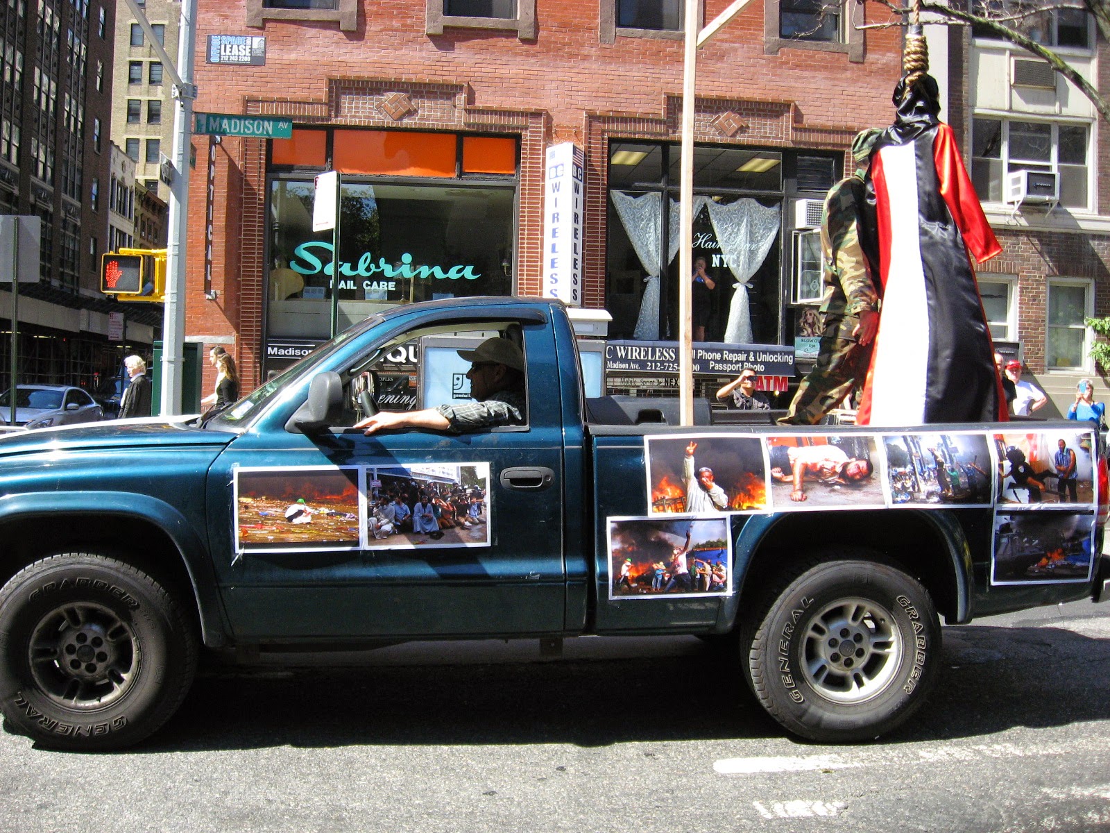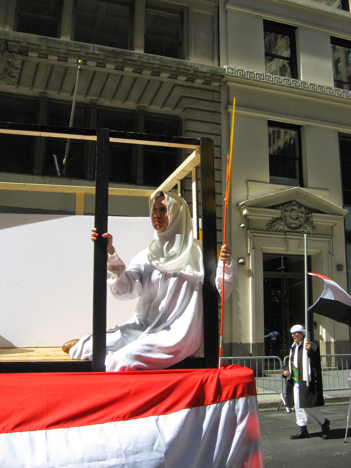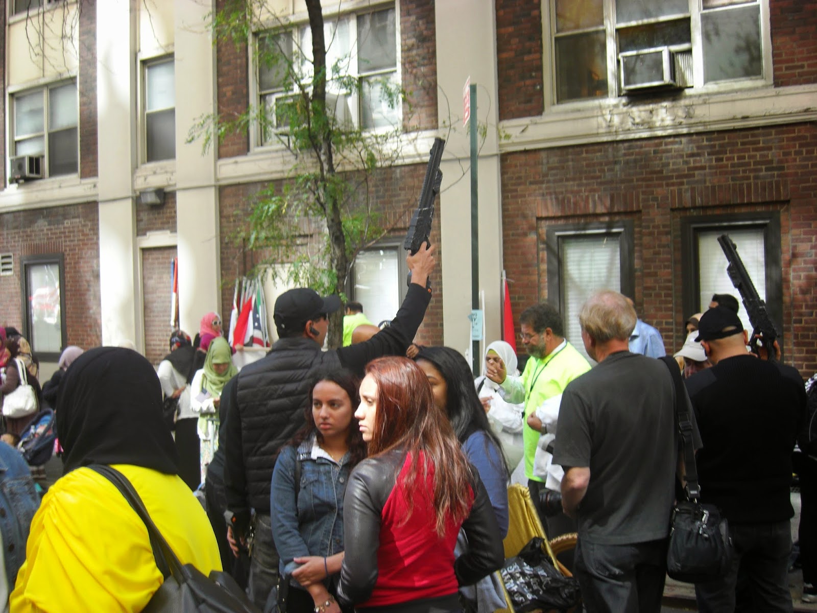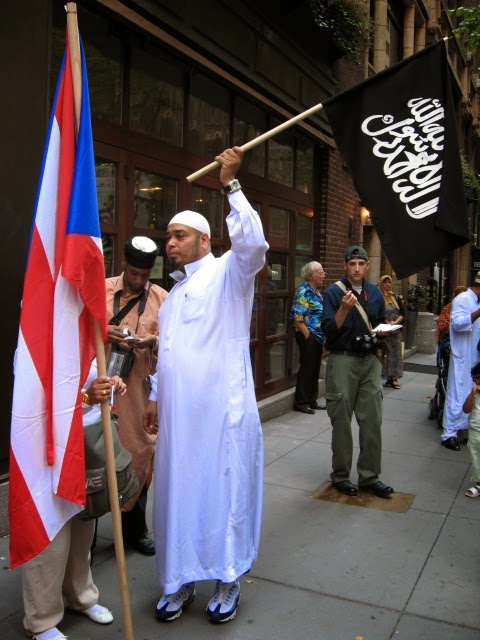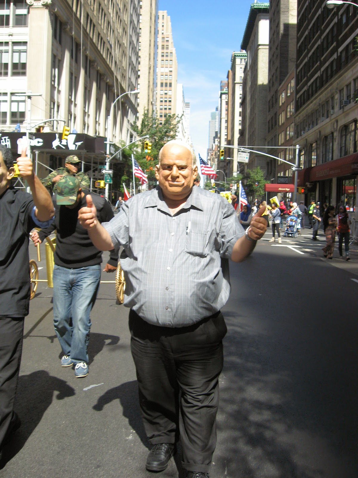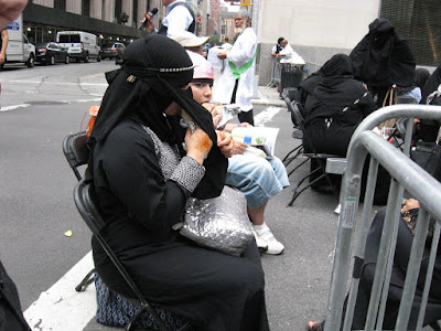 Virtually stripped of all political street theater it was smaller than any other parade over the last several years. No black flags of jihad flying, no blood-drenched Muslim Brotherhood photo displays or white-robed, somber women trucked down the avenue in a cage. Gone was the female effigy swinging from a noose, overseen by thugs dressed up like thugs brandishing 'play' automatic weapons, and whip-cracking ‘Pharoahs’ being pulled on chariots by demonstrators dressed at Egyptian military etc. Absent of any spectacle, one might almost have to ask: 'Was it really even a Muslim Day Parade?' Also missing from the march were children from various private Muslim schools as well as certain mosques throughout the city quite notable by their omission.