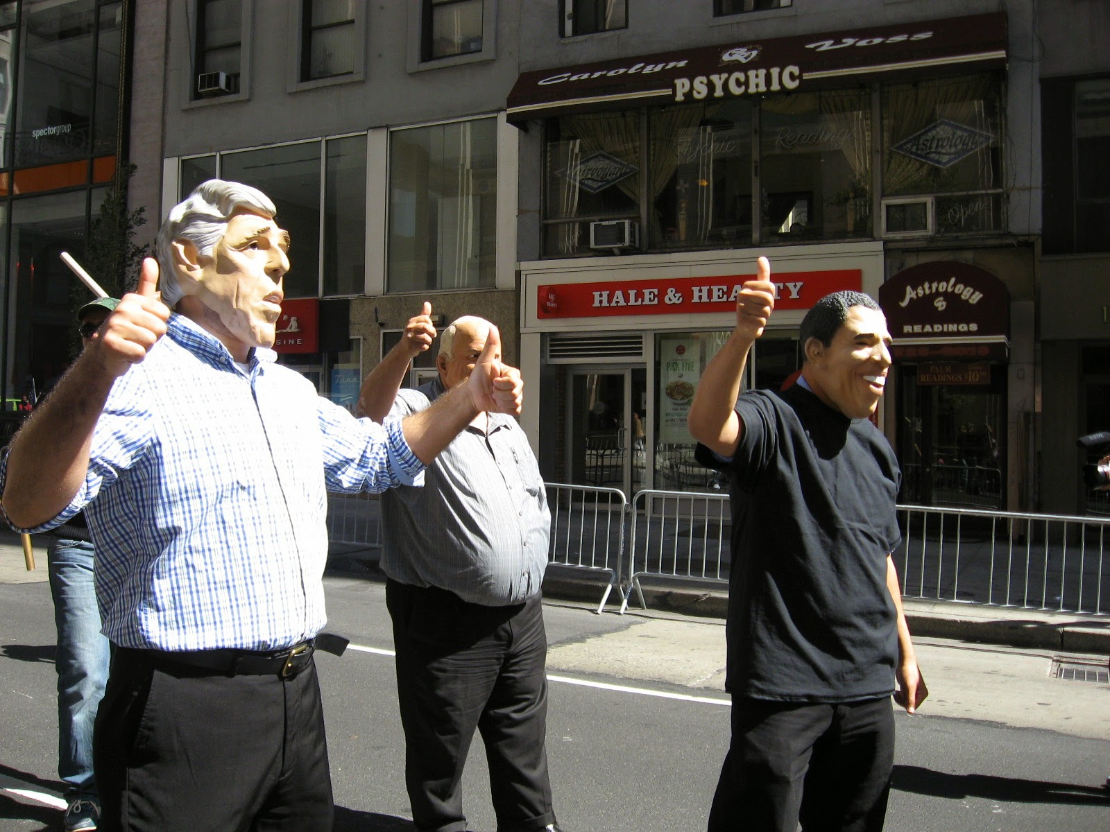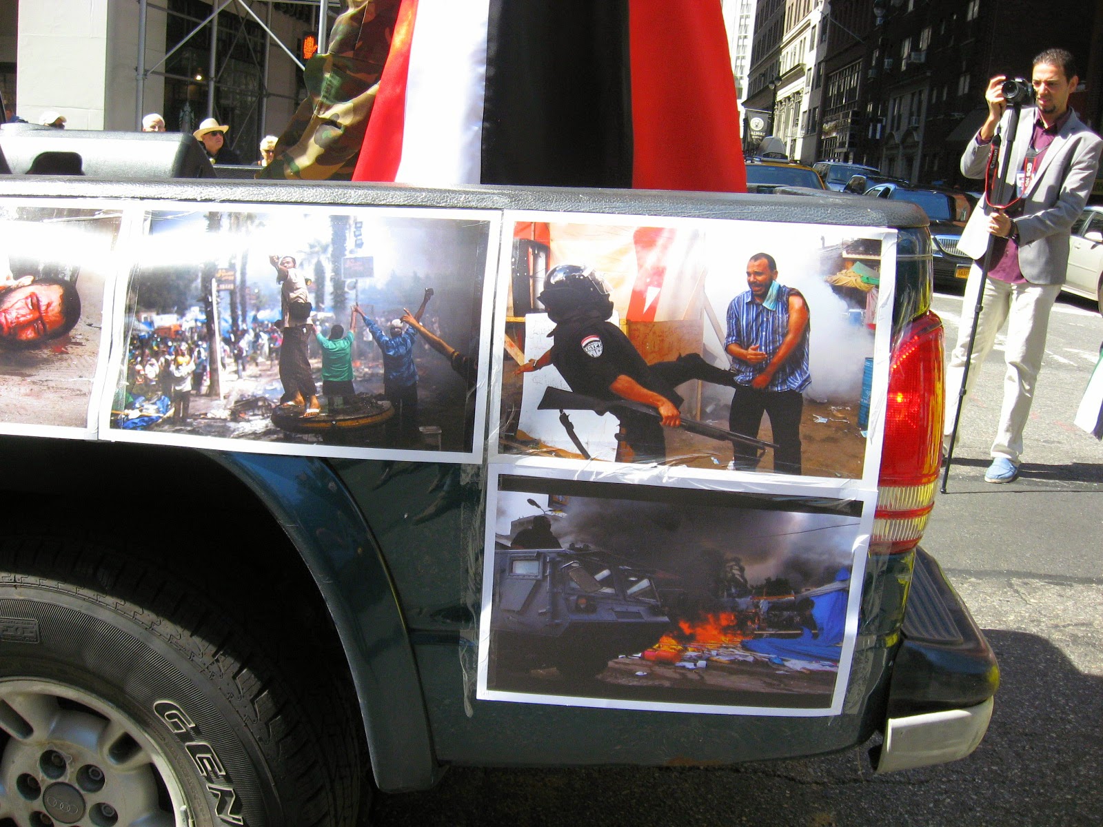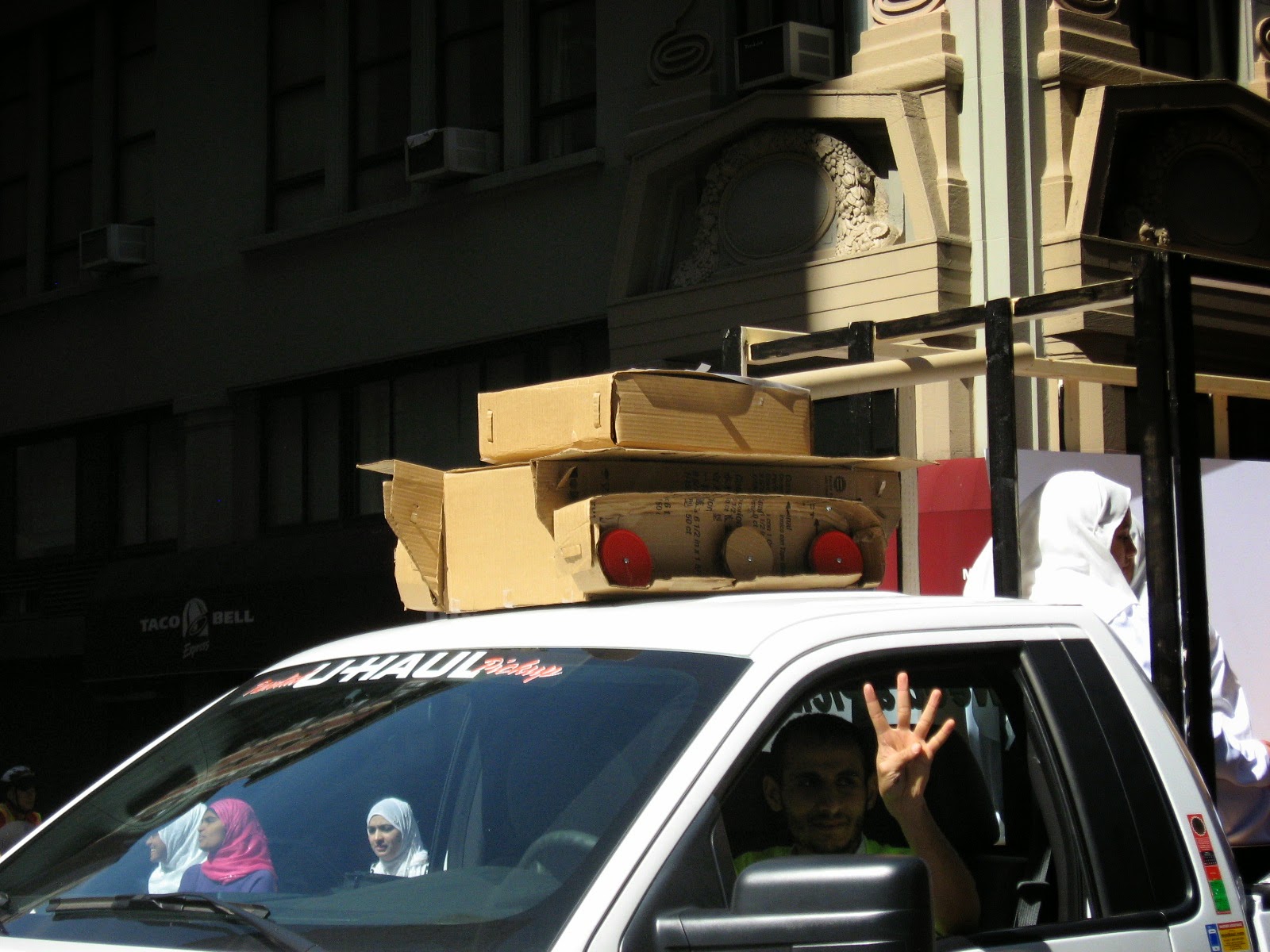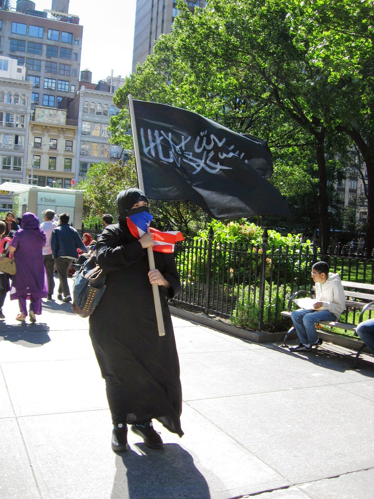 Virtually stripped of all political street theater it was smaller than any other parade over the last several years. No black flags of jihad flying, no blood-drenched Muslim Brotherhood photo displays or white-robed, somber women trucked down the avenue in a cage. Gone was the female effigy swinging from a noose, overseen by thugs dressed up like thugs brandishing 'play' automatic weapons, and whip-cracking ‘Pharoahs’ being pulled on chariots by demonstrators dressed at Egyptian military etc. Absent of any spectacle, one might almost have to ask: 'Was it really even a Muslim Day Parade?' Also missing from the march were children from various private Muslim schools as well as certain mosques throughout the city quite notable by their omission.